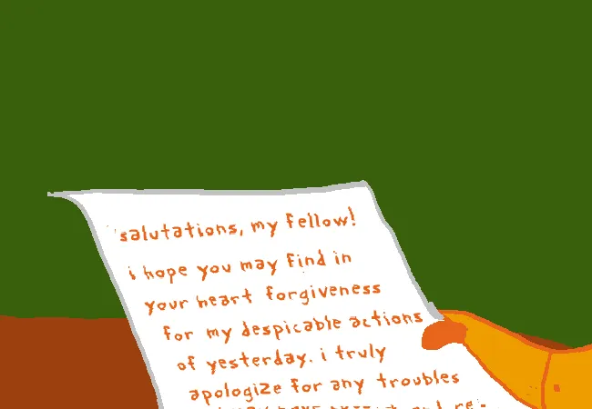 I hope you may find in your heart forgiveness for my despicable actions of yesterday. I truly apologize for any troubles I may have caused, and reinforce none of that was of genuine intention, but merely an acident. I’ve been wandering alone for so long, I fear I have dropped all my elegance and decorum aside, such was my excitation. I’m sorry, but I hope you can look past this bad first impression, otherwise I’d pretty sad.